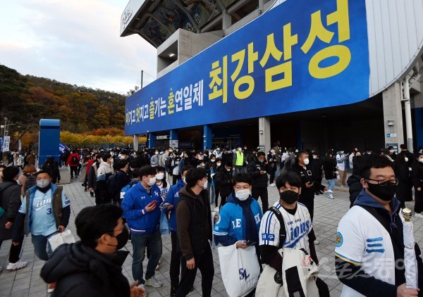 9일 대구 삼성라이온즈파크에서 ‘2021 신한은행 SOL KBO리그’ 삼성 라이온즈와 두산 베어스의 PO 1차전 경기가 열린다. 6년 만에 포스트시즌에 진출한 삼성을 응원하기 위해 많은 야구팬들이 줄을 서서 입장을 기다리고 있다.