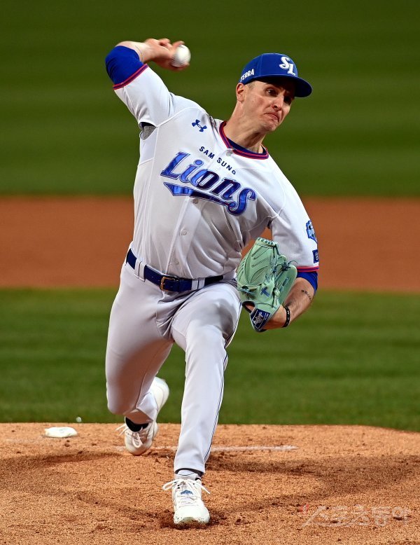 9일 대구 삼성라이온즈파크에서 ‘2021 신한은행 SOL KBO리그’ 삼성 라이온즈와 두산 베어스의 PO 1차전 경기가 열렸다. 삼성 선발투수 뷰캐넌이 힘차게 볼을 던지고 있다.