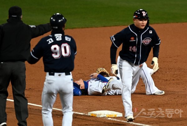 9일 대구 삼성라이온즈파크에서 ‘2021 신한은행 SOL KBO리그’ 삼성 라이온즈와 두산 베어스의 PO 1차전 경기가 열렸다. 2회초 2사 1, 2루에서 삼성 이원석이 내야땅볼 타구를 실책한 뒤 두산 박계범과 충돌해 그라운드에 쓰러져 있다.