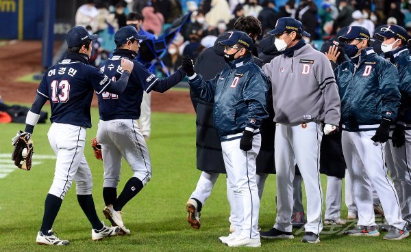 9일 대구 삼성라이온즈파크에서 ‘2021 신한은행 SOL KBO리그’ 삼성 라이온즈와 두산 베어스의 PO 1차전 경기가 열린다. 두산이 삼성에 6-4로 승리한 뒤 김태형 감독이 선수들을 환영하고 있다.