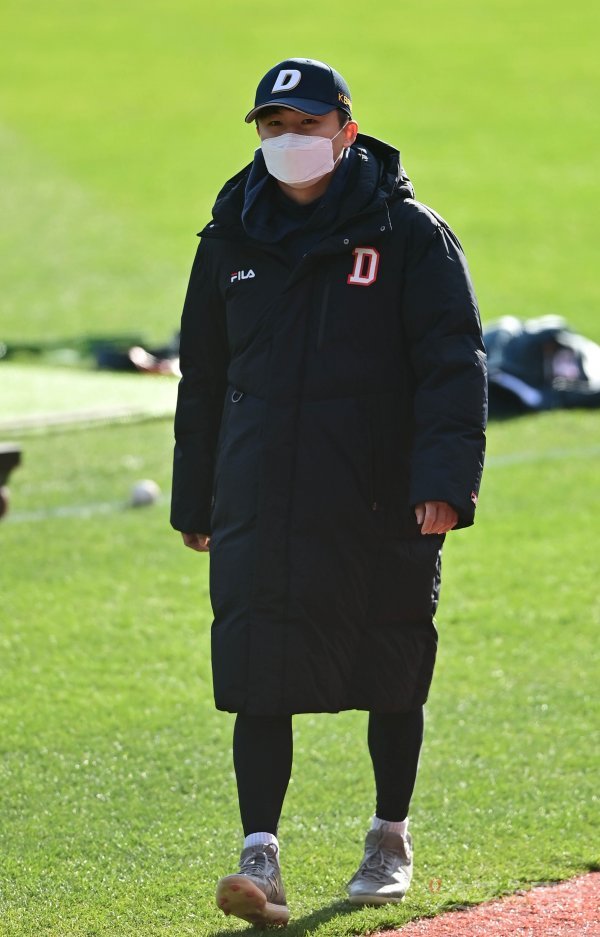 10일 서울 잠실야구장에서 열린 ‘2021 신한은행 SOL KBO리그’ 포스트시즌 플레이오프 2차전 두산 베어스와 삼성 라이온즈의 경기에 앞서 두산 박계범이 롱패딩을 입고 몸을 풀고 있다.