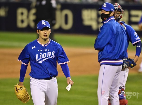 10일 서울 잠실야구장에서 열린 ‘2021 신한은행 SOL KBO리그’ 포스트시즌 플레이오프 2차전 두산 베어스와 삼성 라이온즈의 경기에서 2회말 1사 3루 상황에서 삼성 백정현이 마운드를 내려오고 있다.