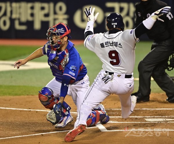 10일 서울 잠실야구장에서 열린 ‘2021 신한은행 SOL KBO리그’ 포스트시즌 플레이오프 2차전 두산 베어스와 삼성 라이온즈의 경기에서 1회말 1사 1, 2루 두산의 중전 적시타 때 삼성 포수 강민호가 2루주자에게 득점을 허용하고 있다.