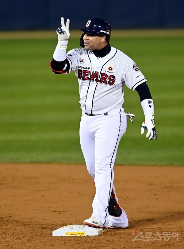 10일 서울 잠실야구장에서 ‘2021 신한은행 SOL KBO리그’ 두산 베어스와 삼성 라이온즈의 PO 2차전 경기가 열렸다. 2회말 1사 1, 3루에서 두산 페르난데스가 2타점 2루타를 날린 뒤 환호하고 있다.