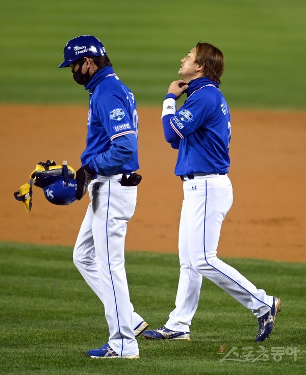 10일 서울 잠실야구장에서 ‘2021 신한은행 SOL KBO리그’ 플레이오프 2차전 삼성 라이온즈와 두산 베어스 경기가 열렸다. 2회초 2사 만루 삼성 김상수가 외야 뜬공으로 아웃된 후 아쉬워하고 있다.