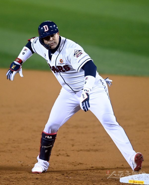 10일 서울 잠실야구장에서 ‘2021 신한은행 SOL KBO리그’ 플레이오프 2차전 삼성 라이온즈와 두산 베어스 경기가 열렸다. 1회말 1사 두산 페르난데스가 좌전 안타를 치고 1루에서 기뻐하고 있다.