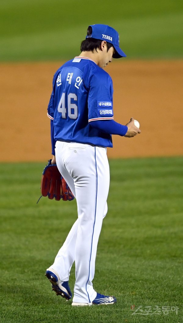 10일 서울 잠실야구장에서 ‘2021 신한은행 SOL KBO리그’ 플레이오프 2차전 삼성 라이온즈와 두산 베어스 경기가 열렸다. 삼성 원태인이 3회말 2사 1,2루 두산 페르난데스에게 1타점 적시타를 허용한 후 아쉬워하고 있다.