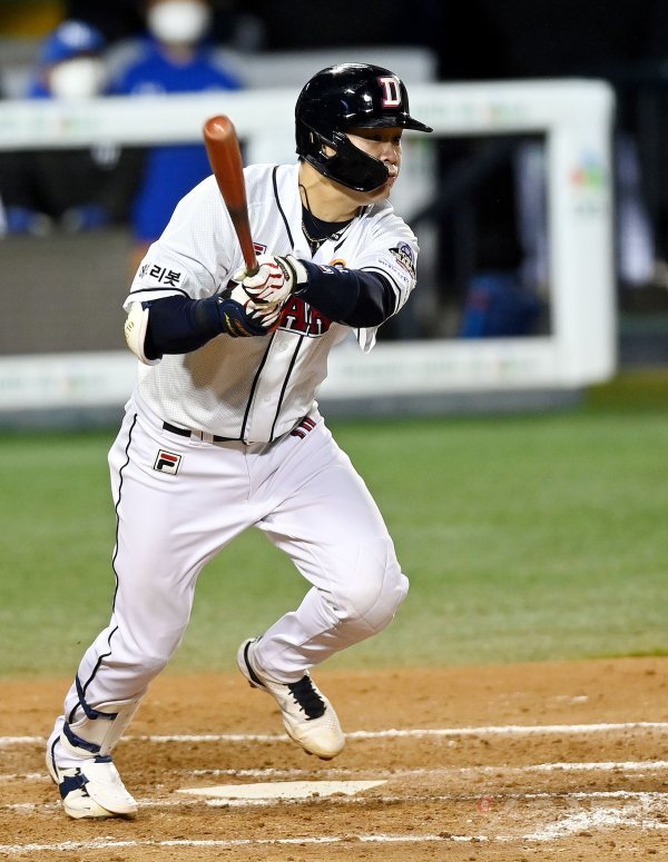 10일 서울 잠실야구장에서 ‘2021 신한은행 SOL KBO리그’ 두산 베어스와 삼성 라이온즈의 PO 2차전 경기가 열렸다. 3회말 1사 2루에서 두산 박세혁이 1타점 2루타를 날리고 있다.
