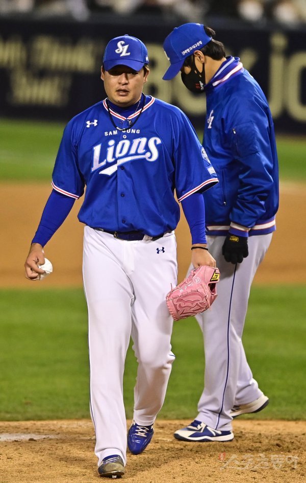 10일 서울 잠실야구장에서 열린 ‘2021 신한은행 SOL KBO리그’ 포스트시즌 플레이오프 2차전 두산 베어스와 삼성 라이온즈의 경기에서 6회말 2사 만루 상황에서 삼성 심창민이 마운드를 내려오고 있다.