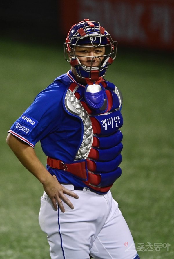 10일 서울 잠실야구장에서 열린 ‘2021 신한은행 SOL KBO리그’ 포스트시즌 플레이오프 2차전 두산 베어스와 삼성 라이온즈의 경기에서 7회말 1사 2루 상황에서 삼성 강민호가 통증을 호소하며 교체되고 있다.