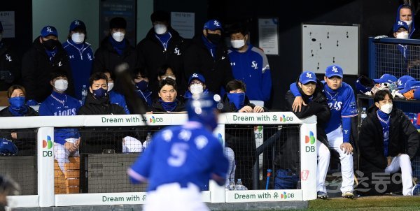 10일 서울 잠실야구장에서 ‘2021 신한은행 SOL KBO리그’ 두산 베어스와 삼성 라이온즈의 PO 2차전 경기가 열렸다. 2-11로 뒤진 삼성의 9회초 마지막 공격 때 선수들이 더그아웃에서 경기를 지켜보고 있다.