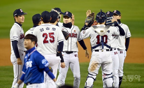 10일 서울 잠실야구장에서 ‘2021 신한은행 SOL KBO리그’ 플레이오프 2차전 삼성 라이온즈와 두산 베어스 경기가 열렸다. 11-3 승리를 거두며 한국시리즈 진출을 확정지은 두산 선수들이 하이파이브 하고 있다.