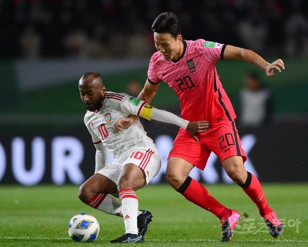 11일 경기도 고양종합운동장에서 열린 ‘2022 FIFA 카타르 월드컵’ 아시아지역 최종예선 A조 5차전 한국과 아랍에미리트의 경기에서 한국 권경원이 아랍에미리트의 볼을 빼앗고 있다.
