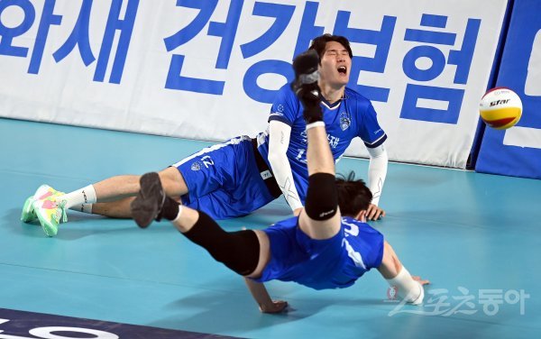 16일 대전충무체육관에서 열린 ‘2021~2022 도드람 V-리그’ 남자부 삼성화재와 OK금융그룹의 경기에서 삼성화재 황경민이 몸을 날려 리시브 시도했으나 놓치고 있다.