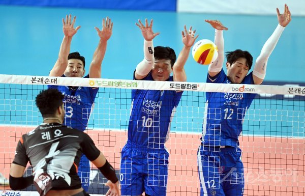 16일 대전충무체육관에서 열린 ‘2021~2022 도드람 V-리그’ 남자부 삼성화재와 OK금융그룹의 경기에서 삼성화재 황경민이 블로킹 득점에 성공하고 있다.