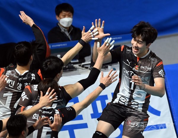 16일 대전충무체육관에서 열린 ‘2021~2022 도드람 V-리그’ 남자부 삼성화재와 OK금융그룹의 경기에서 OK금융그룹 박승수가 서브 득점에 성공한 후 기뻐하고 있다.