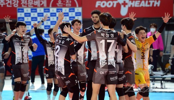 16일 대전충무체육관에서 열린 ‘2021~2022 도드람 V-리그’ 남자부 삼성화재와 OK금융그룹의 경기에서 세트스코어 3-2 승리를 거둔 OK금융그룹 선수들이 기뻐하고 있다.