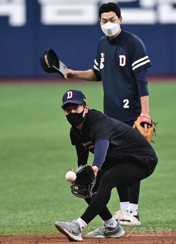 17일 서울 고척스카이돔에서 열린 ‘2021 신한은행 SOL KBO리그’ 포스트시즌 한국시리즈 3차전 두산 베어스와 KT 위즈의 경기에 앞서 두산 김재호가 수비 훈련을 하고 있다.
