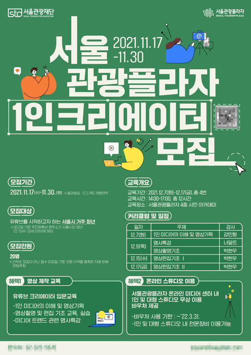 서울관광재단(대표이사 길기연)은 17일부터 ‘서울관광플라자 1인 크리에이터 모집’ 이벤트를 30일까지 진행한다.서울관광플라자 시민아카데미서 4회 교육