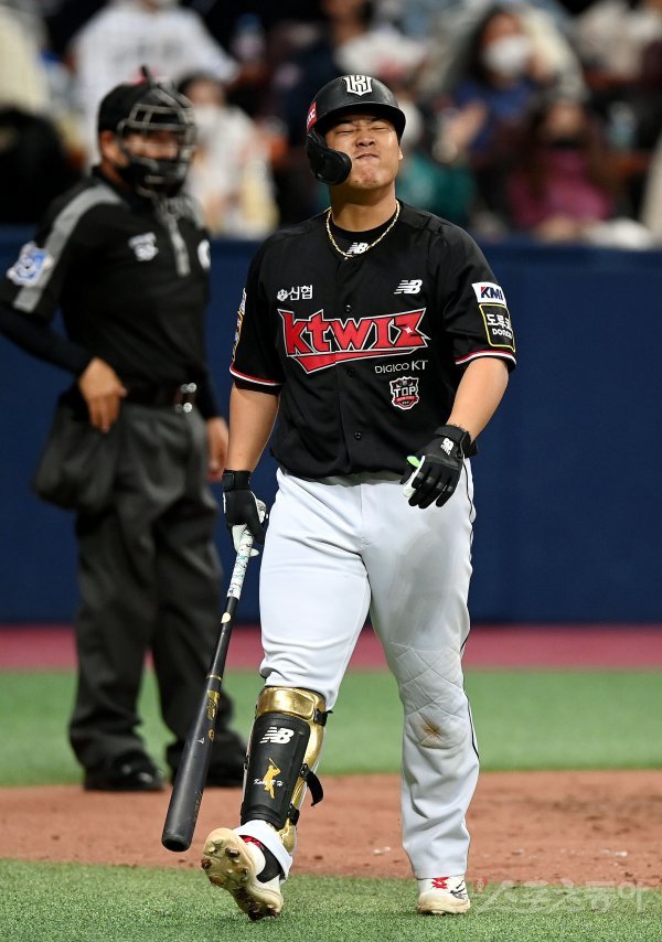 17일 서울 고척스카이돔에서 ‘2021 신한은행 SOL KBO리그’ KT 위즈와 두산 베어스의 한국시리즈 3차전 경기가 열렸다. 4회초 무사에서 KT 강백호가 삼진 아웃으로 물러나며 아쉬워하고 있다. 고척 | 김민성 기자 marineboy@donga.com