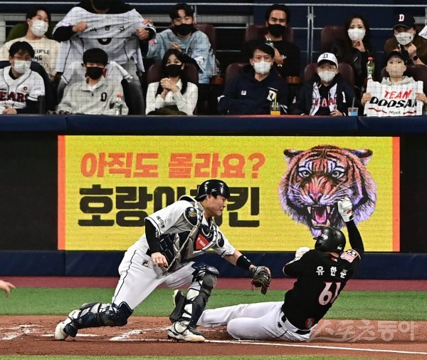 17일 서울 고척스카이돔에서 열린 ‘2021 신한은행 SOL KBO리그’ 포스트시즌 한국시리즈 3차전 두산 베어스와 KT 위즈의 경기에서 2회초 2사 2루 KT의 우전 안타 때 두산 포수 박세혁이 홈에서 2루주자 유한준을 태그 아웃시키고 있다.