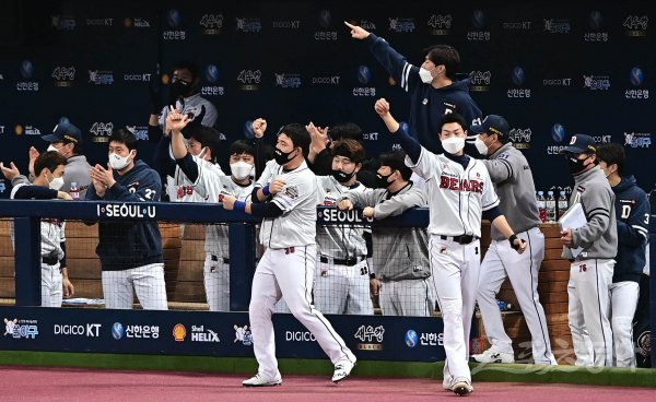 17일 서울 고척스카이돔에서 열린 ‘2021 신한은행 SOL KBO리그’ 포스트시즌 한국시리즈 3차전 두산 베어스와 KT 위즈의 경기에서 2회초 2사 2루 KT의 우전 안타 때 2루주자를 홈에서 아웃시키자 두산 더그아웃의 선수들이 기뻐하고 있다. 고척 | 주현희 기자 teth1147@donga.com
