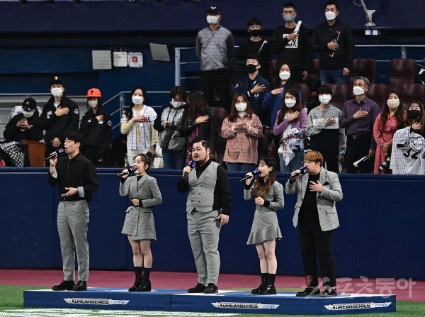17일 서울 고척스카이돔에서 열린 ‘2021 신한은행 SOL KBO리그’ 포스트시즌 한국시리즈 3차전 두산 베어스와 KT 위즈의 경기에 앞서 아카펠라 그룹 나린이 애국가를 제창하고 있다.