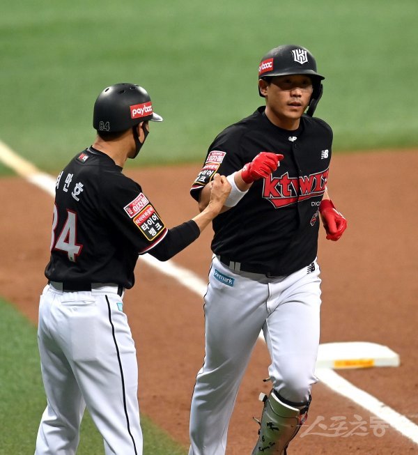 17일 서울 고척스카돔에서 ‘2021 신한은행 SOL KBO리그’ 한국시리즈 3차전 KT위즈와 두산 베어스의 중립 경기가 열렸다. 5회초 1사 KT 박경수가 선제 좌월 솔로 홈런을 날린 후 그라운드를 돌며 하이파이브 하고 있다.
