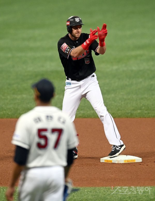 17일 서울 고척스카돔에서 ‘2021 신한은행 SOL KBO리그’ 한국시리즈 3차전 KT위즈와 두산 베어스의 중립 경기가 열렸다. 4회초 2사 KT 호잉이 우전 2루타를 치고 2루에서 기뻐하고 있다.