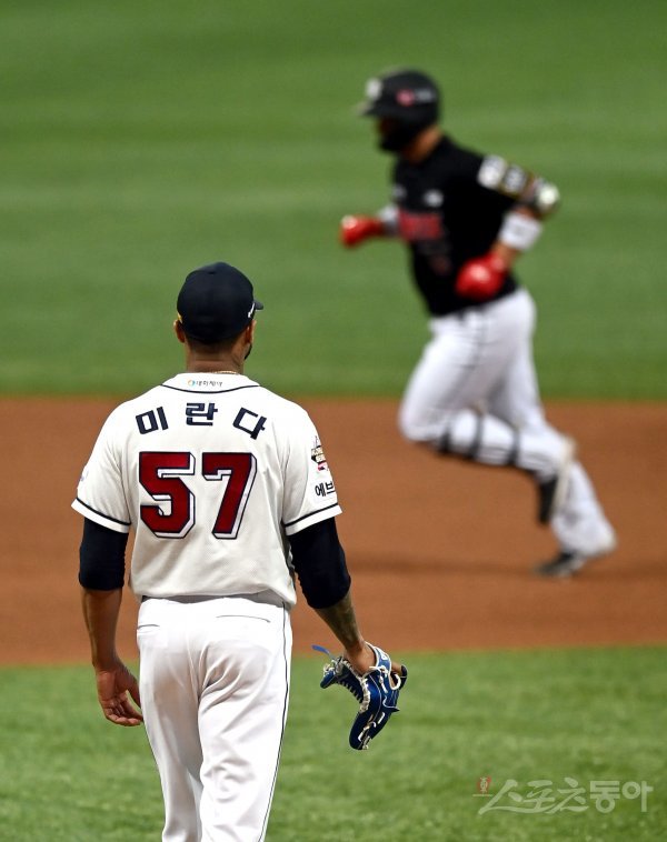 17일 서울 고척스카돔에서 ‘2021 신한은행 SOL KBO리그’ 한국시리즈 3차전 KT위즈와 두산 베어스의 중립 경기가 열렸다. 두산 선발 미란다가 5회초 1사 KT 박경수에게 선제 좌월 솔로 홈런을 허용하고 있다.