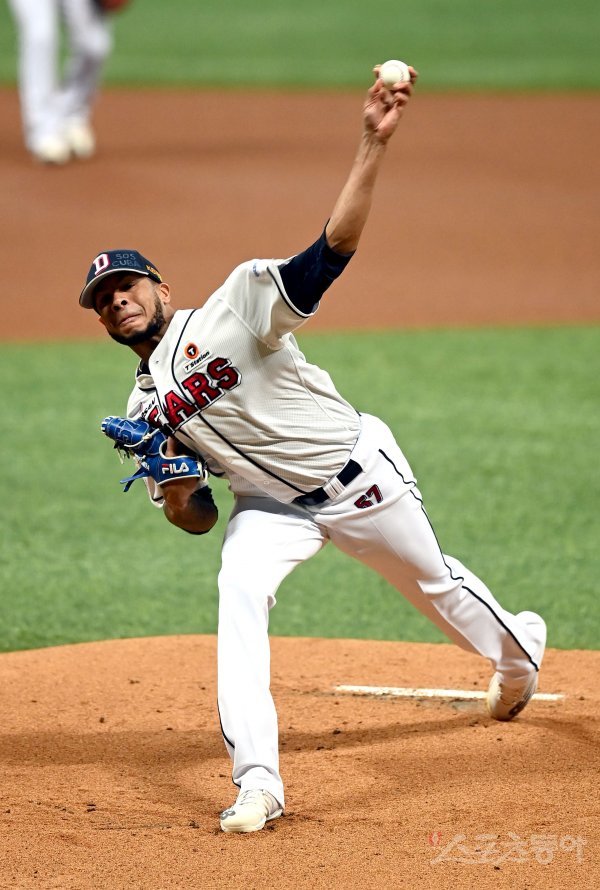 17일 서울 고척스카돔에서 ‘2021 신한은행 SOL KBO리그’ 한국시리즈 3차전 KT위즈와 두산 베어스의 중립 경기가 열렸다. 선발 투수로 등판한 두산 미란다가 역투하고 있다.