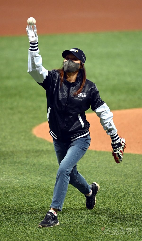17일 서울 고척스카돔에서 ‘2021 신한은행 SOL KBO리그’ 한국시리즈 3차전 KT위즈와 두산 베어스의 중립 경기가 열렸다. 경기 전 코로나19 자원봉사자 이연숙 씨가 시구를 하고 있다.