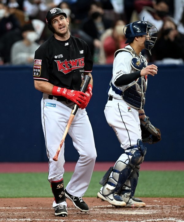 17일 서울 고척스카이돔에서 ‘2021 신한은행 SOL KBO리그’ KT 위즈와 두산 베어스의 한국시리즈 3차전 경기가 열렸다. 6회초 무사 만루에서 KT 호잉이 삼진 아웃으로 물러나고 있다.