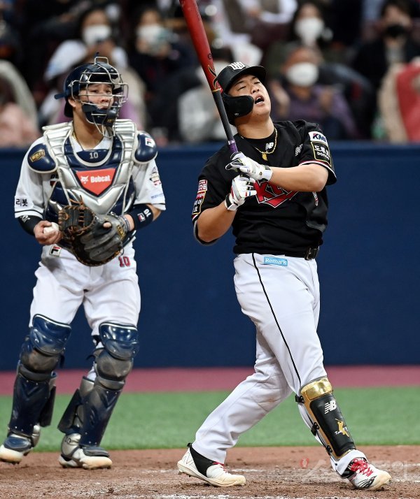 17일 서울 고척스카이돔에서 ‘2021 신한은행 SOL KBO리그’ KT 위즈와 두산 베어스의 한국시리즈 3차전 경기가 열렸다. 7회초 2사 1루에서 KT 강백호가 삼진 아웃으로 물러나고 있다. 고척 | 김민성 기자 marineboy@donga.com