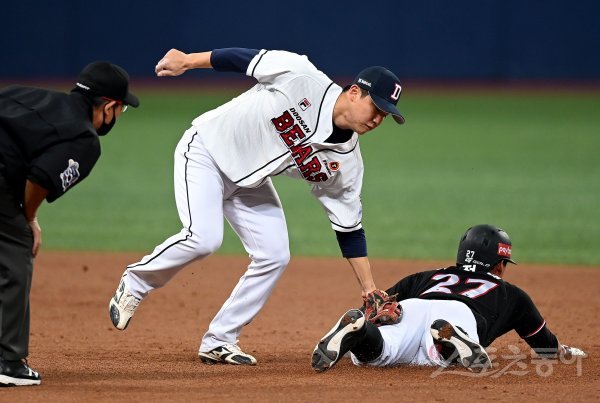 17일 서울 고척스카이돔에서 ‘2021 신한은행 SOL KBO리그’ KT 위즈와 두산 베어스의 한국시리즈 3차전 경기가 열렸다. 7회초 무사 1루에서 KT 배정대가 2루 도루를 성공시키고 있다. 고척 | 김민성 기자 marineboy@donga.com