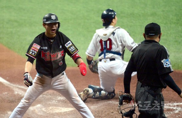 17일 서울 고척스카돔에서 ‘2021 신한은행 SOL KBO리그’ 한국시리즈 3차전 KT위즈와 두산 베어스의 중립 경기가 열렸다. 7회초 1사 1,3루 KT 황재균 외야 뜬공 때 3루주자 심우준이 태그업 시도해 홈에서 세이프 된 후 기뻐하고 있다.