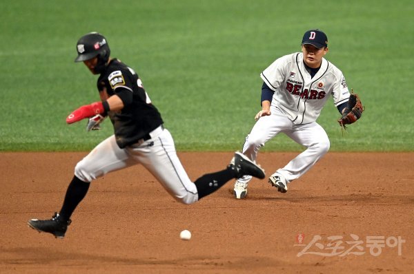 17일 서울 고척스카돔에서 ‘2021 신한은행 SOL KBO리그’ 한국시리즈 3차전 KT위즈와 두산 베어스의 중립 경기가 열렸다. 7회초 무사 1,2루 두산 박계범이 땅볼 타구를 처리하고 있다. 고척 | 김종원 기자 won@donga.com