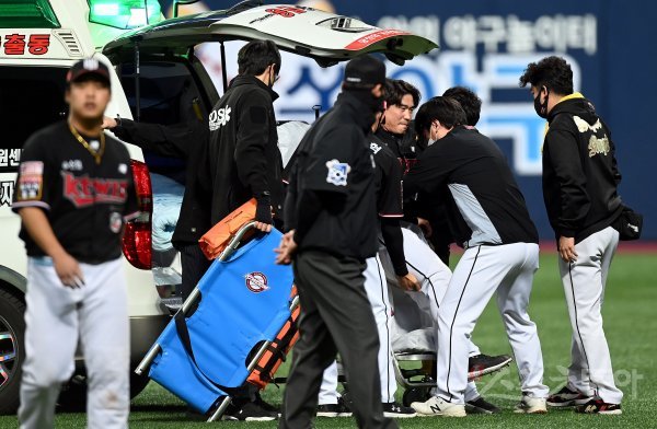 17일 서울 고척스카이돔에서 ‘2021 신한은행 SOL KBO리그’ KT 위즈와 두산 베어스의 한국시리즈 3차전 경기가 열렸다. 8회말 무사 1루에서 KT 박경수가 타구를 잡으려다 부상을 당한 뒤 구급차로 이송되고 있다.