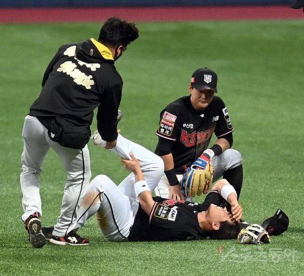 17일 서울 고척스카돔에서 ‘2021 신한은행 SOL KBO리그’ 한국시리즈 3차전 KT위즈와 두산 베어스의 중립 경기가 열렸다. 8회초 무사 1루 KT 박경수가 두산 안재석의 뜬공을 잡다 부상을 당해 고통스러워 하고 있다.