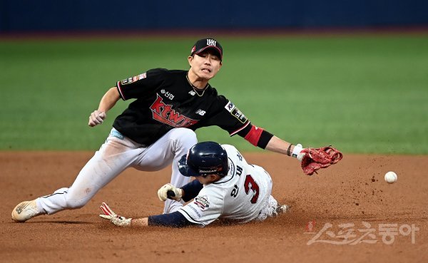 17일 서울 고척스카이돔에서 ‘2021 신한은행 SOL KBO리그’ KT 위즈와 두산 베어스의 한국시리즈 3차전 경기가 열렸다. 8회말 1사 1루에서 내야땅볼 때 KT 심우준이 두산 안재석의 2루 진루를 막으려다 볼이 빠지고 있다.