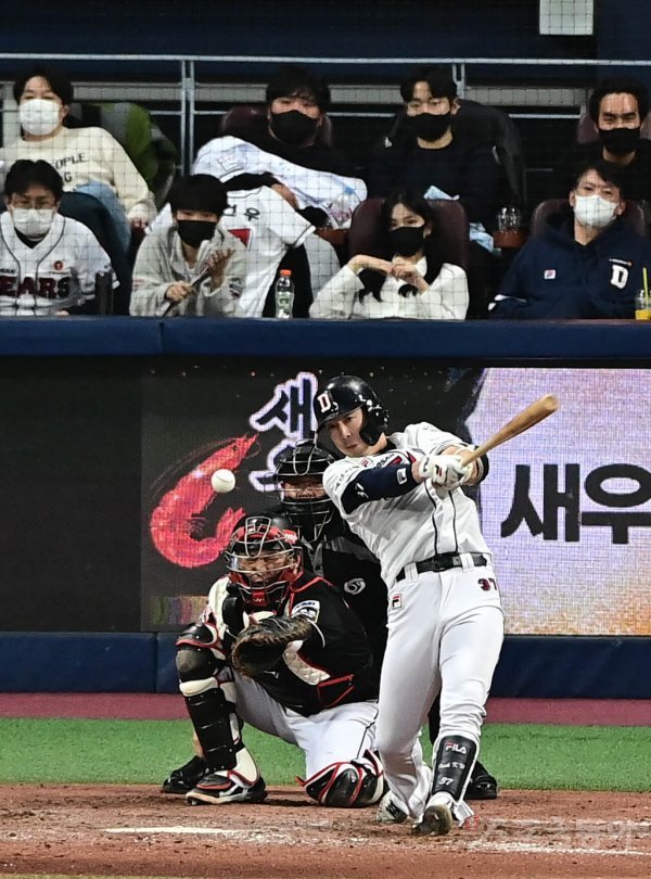 17일 서울 고척스카이돔에서 열린 ‘2021 신한은행 SOL KBO리그’ 포스트시즌 한국시리즈 3차전 두산 베어스와 KT 위즈의 경기에서 8회말 2사 2루 두산 박건우가 1타점 중전 적시타를 치고 있다.