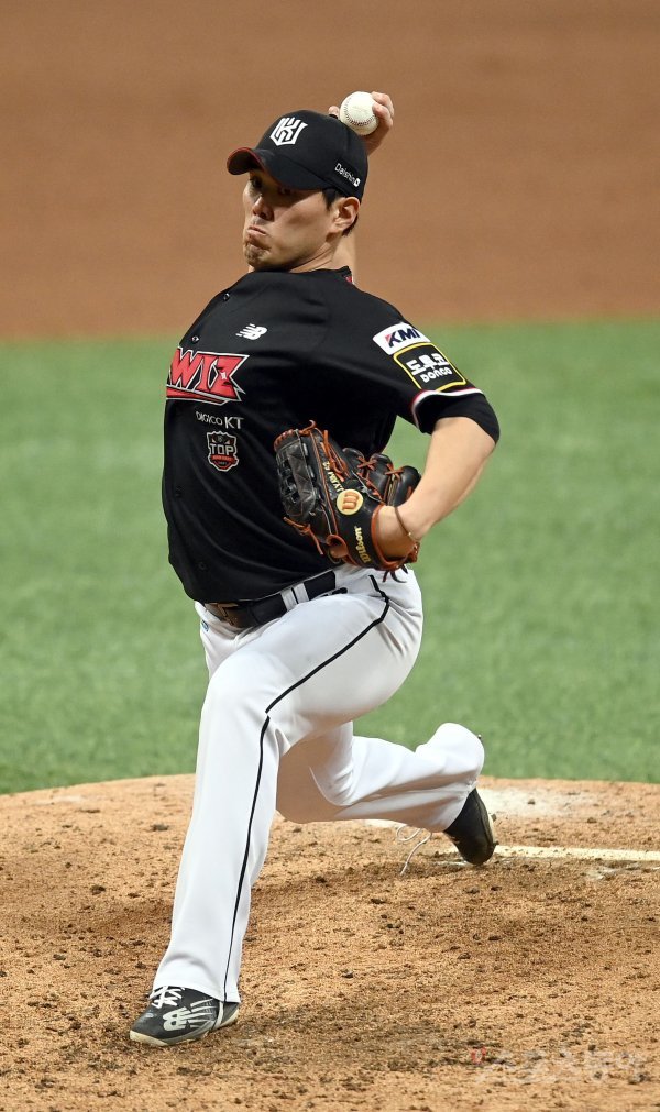 17일 서울 고척스카돔에서 ‘2021 신한은행 SOL KBO리그’ 한국시리즈 3차전 KT위즈와 두산 베어스의 중립 경기가 열렸다. 9회말 등판한 KT 김재윤이 역투하고 있다.