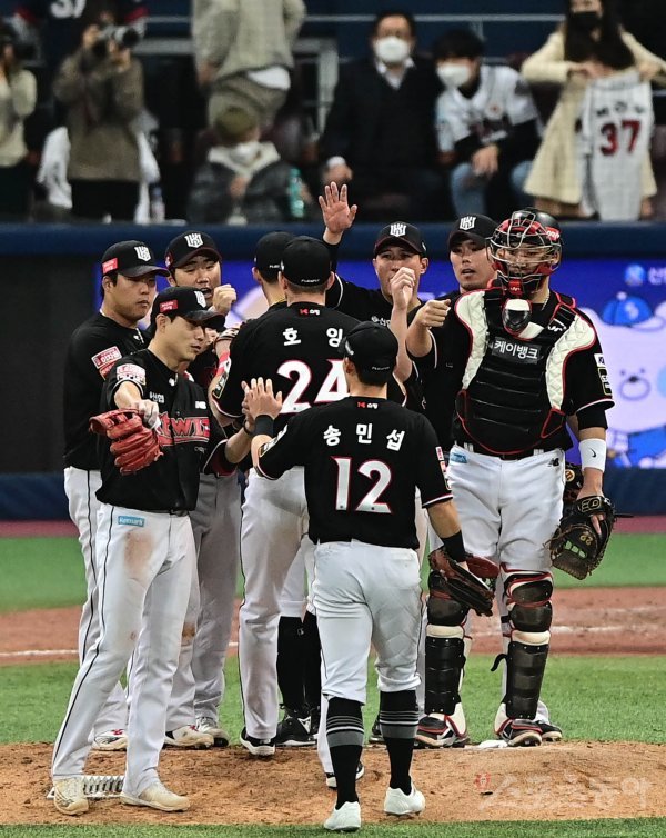17일 서울 고척스카이돔에서 열린 ‘2021 신한은행 SOL KBO리그’ 포스트시즌 한국시리즈 3차전 두산 베어스와 KT 위즈의 경기에서 KT가 두산에 3-1로 승리를 거둔 뒤 선수들이 기쁨을 나누고 있다.