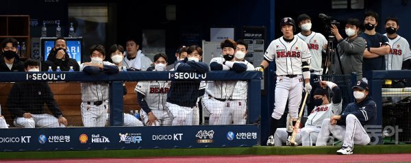 17일 서울 고척스카이돔에서 ‘2021 신한은행 SOL KBO리그’ KT 위즈와 두산 베어스의 한국시리즈 3차전 경기가 열렸다. 1-3으로 뒤진 두산의 9회말 마지막 공격 때 선수들이 경기를 지켜보고 있다.