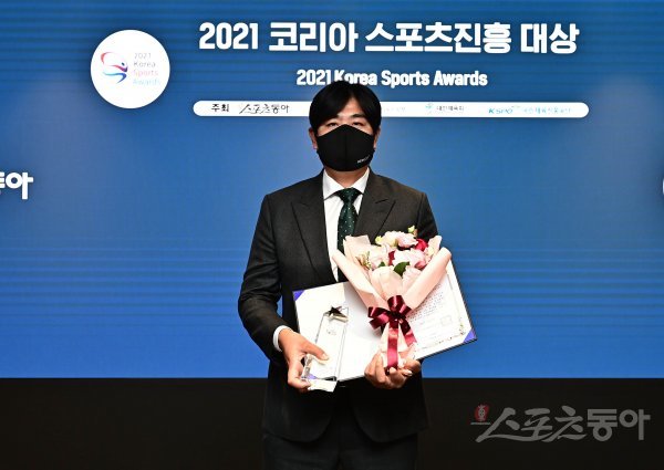 ‘2021 코리아 스포츠진흥 대상(주최:스포츠동아, 후원:문화체육관광부, 대한체육회, 국민체육진흥공단)’ 시상식이 18일 서울 중구 을지로 서울더존을지타워에서 열렸다. 프로야구 마케팅 부문 대상을 수상한 한화 이글스를 대표해 정민철 단장이 기념 촬영을 하고 있다.