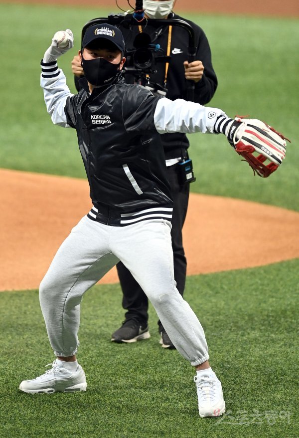 18일 서울 고척스카돔에서 ‘2021 신한은행 SOL KBO리그’ 한국시리즈 4차전 KT위즈와 두산 베어스의 중립 경기가 열렸다. 경기 전 2020 도쿄올림픽 2관왕 양국 국가대표 김제덕이 시구를 하고 있다. 고척 | 김종원 기자 won@donga.com