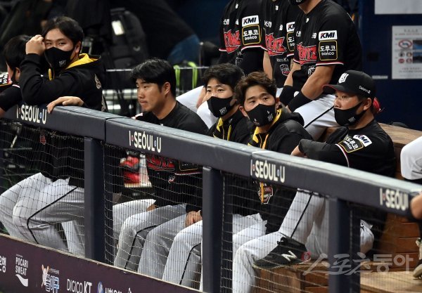 18일 서울 고척스카돔에서 ‘2021 신한은행 SOL KBO리그’ 한국시리즈 4차전 KT위즈와 두산 베어스의 중립 경기가 열렸다. 전날 경기에서 종아리 근육 파열 부상을 당한 KT 박경수가 더그아웃에서 동료들과 함께하고 있다. 고척 | 김종원 기자 won@donga.com