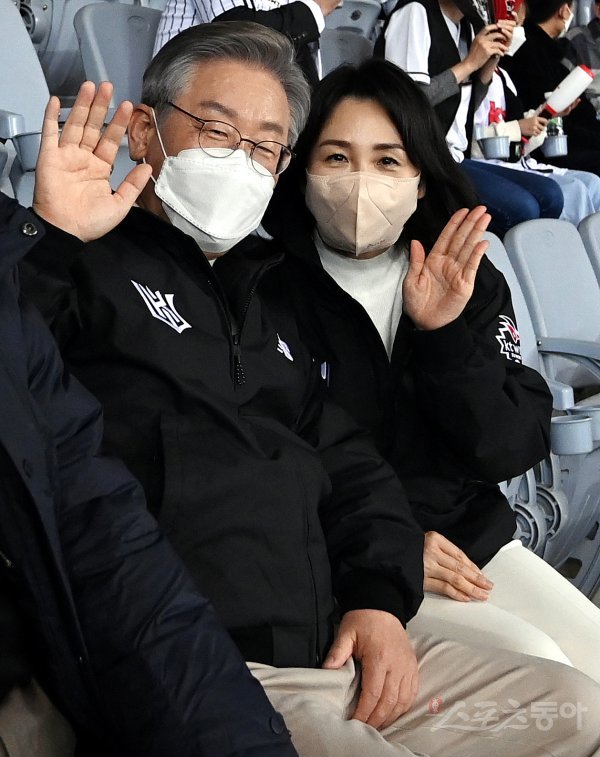 18일 서울 고척스카이돔에서 ‘2021 신한은행 SOL KBO리그’ KT 위즈와 두산 베어스의 한국시리즈 4차전 경기가 열렸다. 이재명 더불어민주당 대선후보가 부인과 함께 야구장을 찾아 응원을 펼치고 있다.