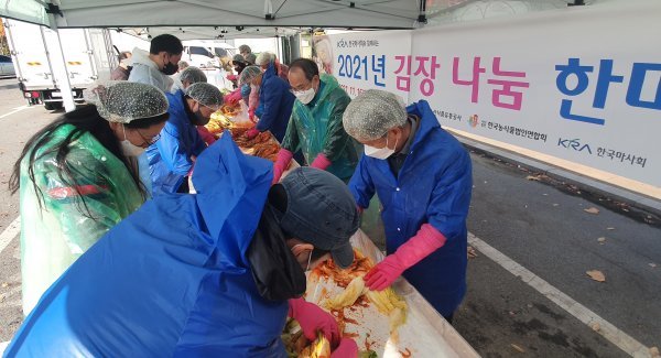 한국마사회는 바로마켓 입점농가와 함께 16일 서울 경마공원 야외 행사장에서 ‘김장 나눔 행사’를 시행했다. 마사회 임직원을 비롯해 바로마켓 운영사인 한국농식품법인연합회, 바로마켓 자치회 등 봉사자 약 30명이 참여했다.