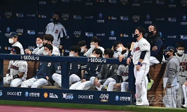 18일 서울 고척스카이돔에서 열린 ‘2021 신한은행 SOL KBO리그’ 포스트시즌 한국시리즈 4차전 두산 베어스와 KT 위즈의 경기에서 2회초 2사 1, 3루 KT의 1타점 적시타 때 두산 더그아웃의 선수들이 아쉬워하고 있다.